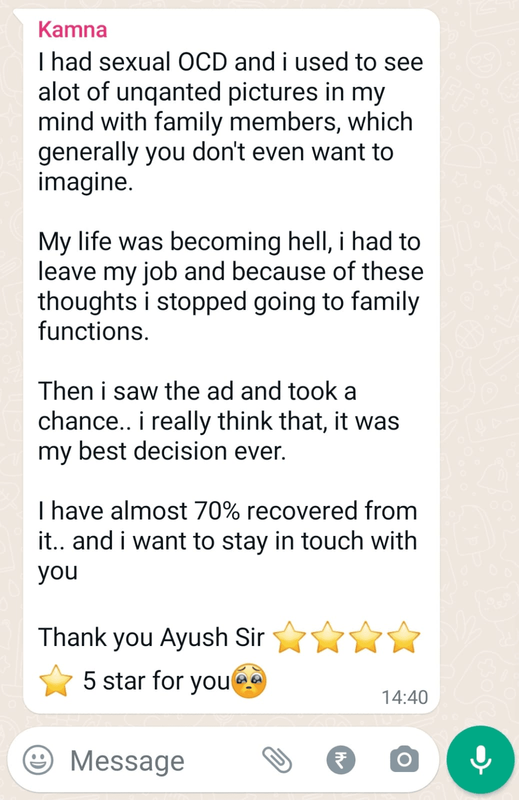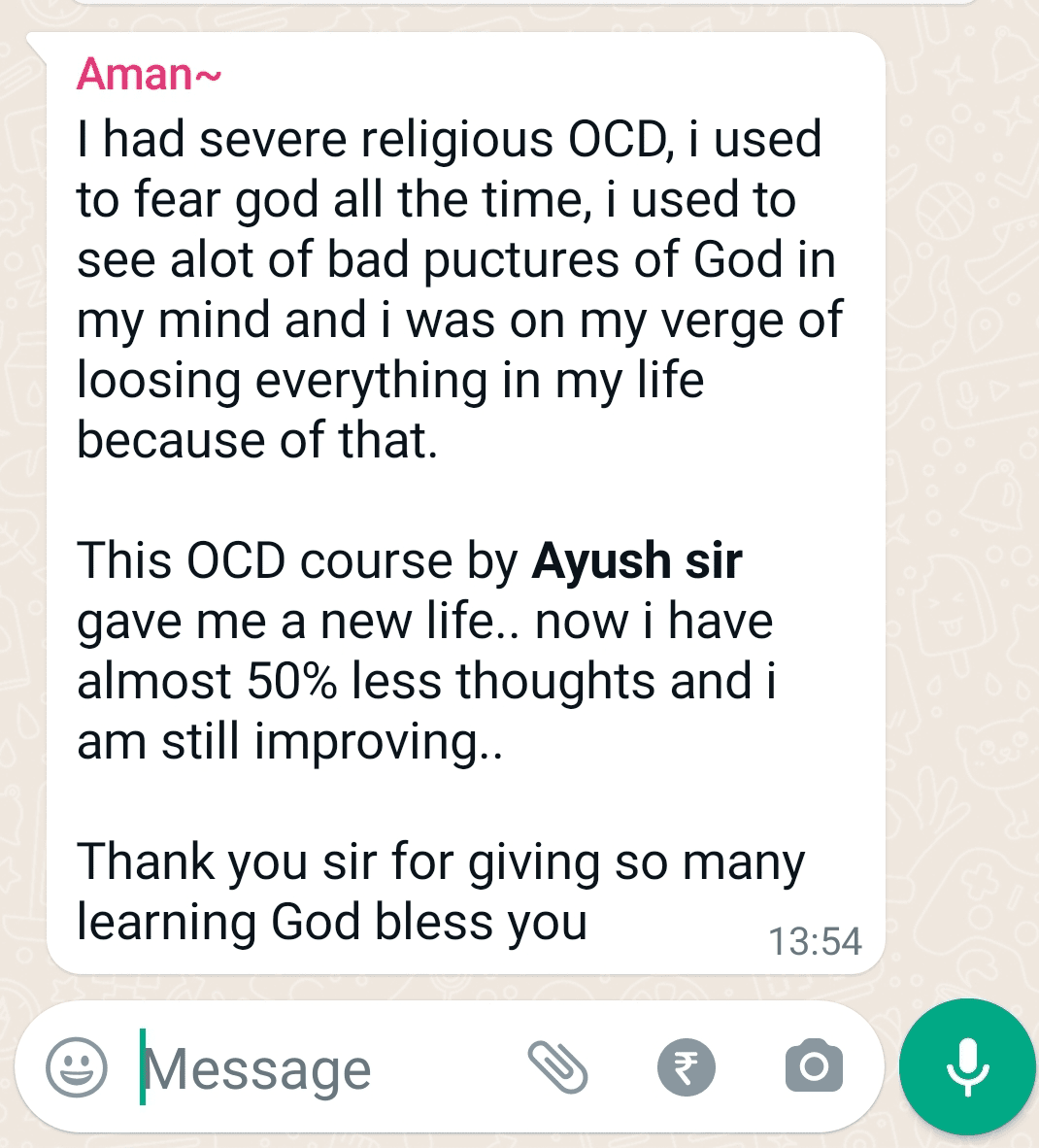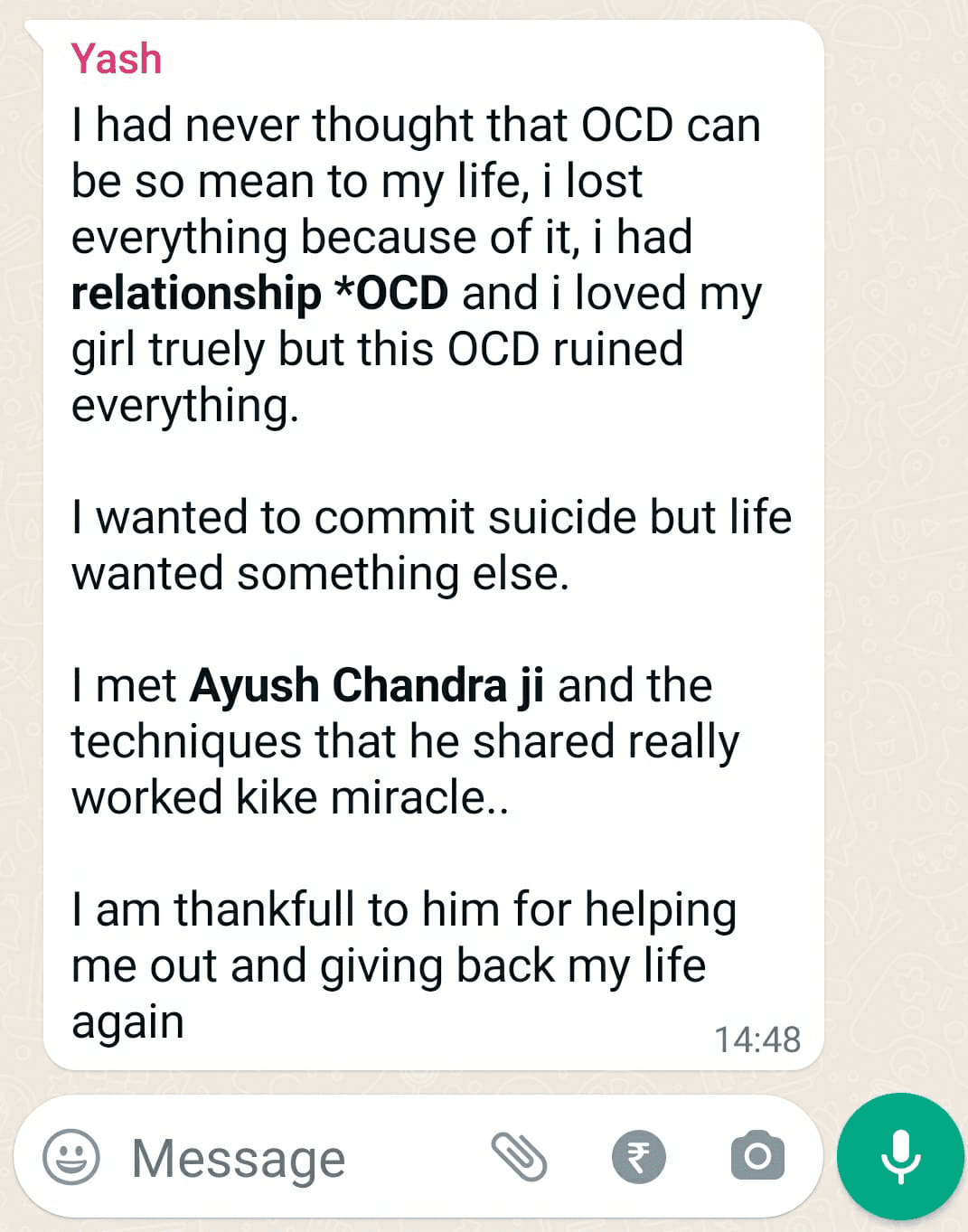 Finally, get instant gauranteed relief from anxiety and stress during the Live session and get a sure chance to interact live with Psy. Ayush Chandra regarding your OCD issue. |