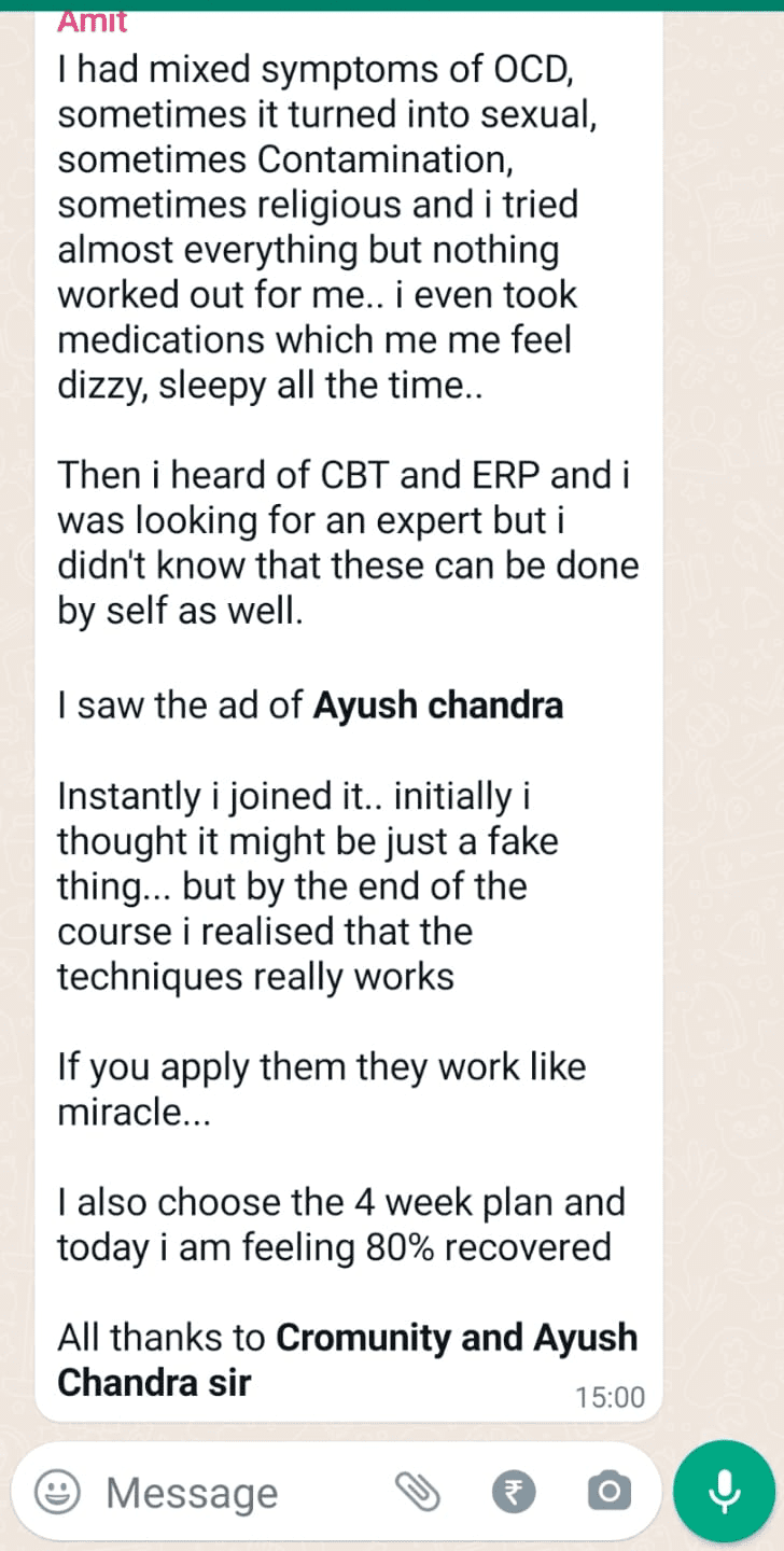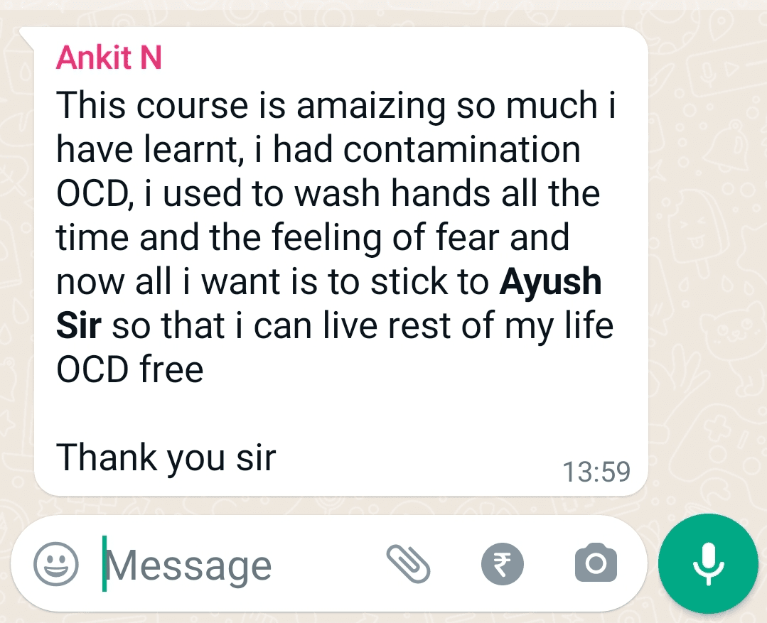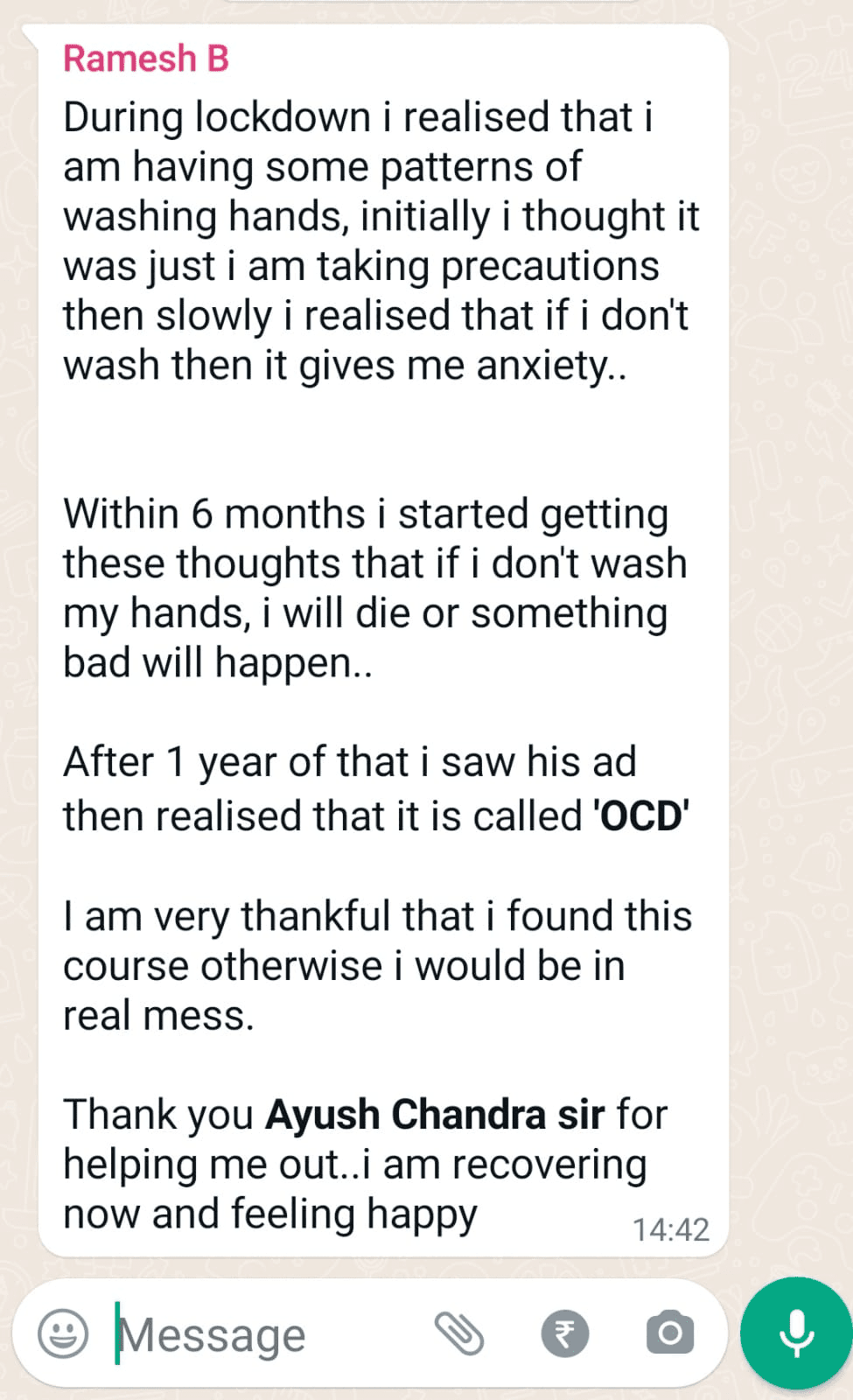 Finally, get instant gauranteed relief from anxiety and stress during the Live session and get a sure chance to interact live with Psy. Ayush Chandra regarding your OCD issue. |